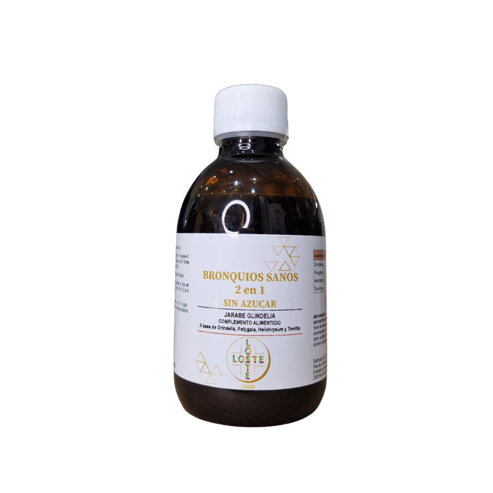 El Bronquios Sanos 2 en 1 Sin Azúcar Loste es un jarabe a base de extractos naturales de Grindelia, Polígala, Helichrysum y Tomillo, ingredientes tradicionalmente utilizados para favorecer la salud respiratoria. Su fórmula ayuda a calmar la irritación de garganta, suavizar las vías respiratorias y contribuir al bienestar de los bronquios.