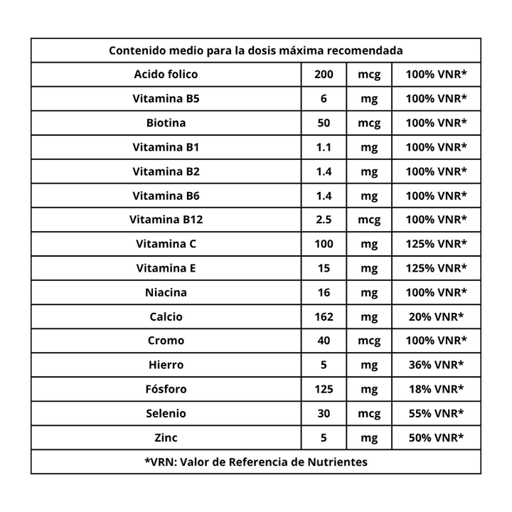 Fosforo de calcio dibásico, vitamina c, vitamina e, fumarato de hierro, nicotinamida, pantotenato de calcio, óxido de zinc, vitamas B1-B2-B6-B12, cloruro de cromo, quelato de selenio, ácido folico y biotina. Excipientes: celulosa microcristalina y estearato de magnesio.Advertencias y/o riesgos