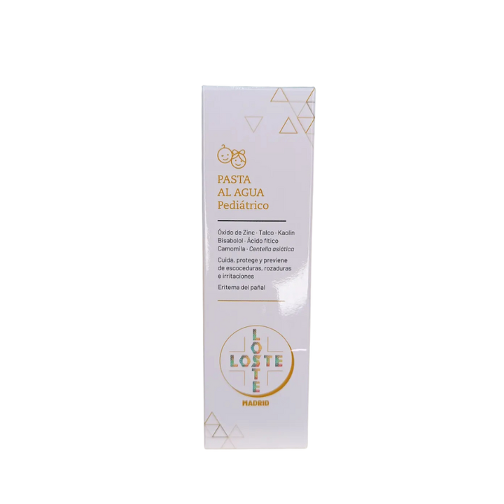 La Pasta al Agua Pediátrico Loste está especialmente formulada para el cuidado diario de la delicada piel del bebé. Gracias a su contenido en óxido de zinc, talco, caolín, bisabolol, ácido fítico, camomila y centella asiática, protege eficazmente frente a la humedad y ayuda a prevenir escoceduras, rozaduras e irritaciones.