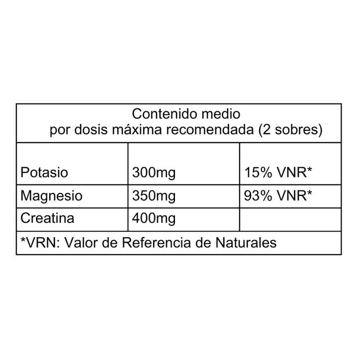 Citrato de potasio, carbonato de potasio, óxido de magnesio, citrato de magnesio, creatina, ácido cítrico, bicarbonato de sodio, acesulfamo , aroma de naranja. Excipiente: Maltodextrina.Advertencias y/o riesgos