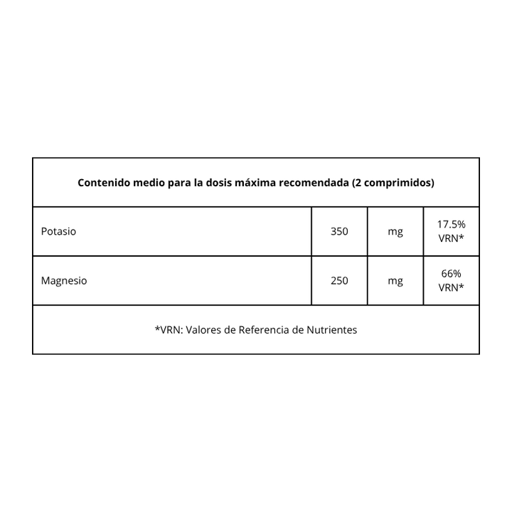 Citrato de potasio, Carbonato de potasio, Óxido de magnesio, Citrato de magnesio. Excipientes: Celulosa, microcristalina y Magnesio Estearato.Advertencias y/o riesgos