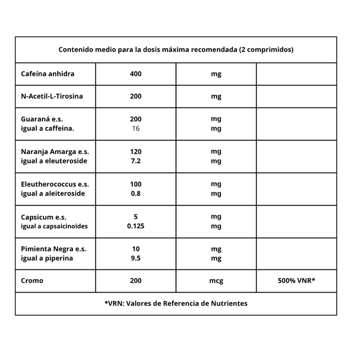 cafeína anhidra, N-acetil-L-tirosina, guaraná d.e. (Paullinia Cupana tit. 8% cafeína, semillas), Naranja Amarga e.s. (Citrus Aurantium tit. 6% sinefria, fruta) Eleutheroccocus d.e. (Eleutherococus Senticosus tit. 0,8% de eleuterosido, raíz) Capsicum e.s. (capsicum Annuum tit. 2,5% capsaicinoides, fruta) Pimienta negra e.s. (piper Nigrum tit. 95% piperina, futas) Picolinato de cromo.Advertencias y/o riesgos
